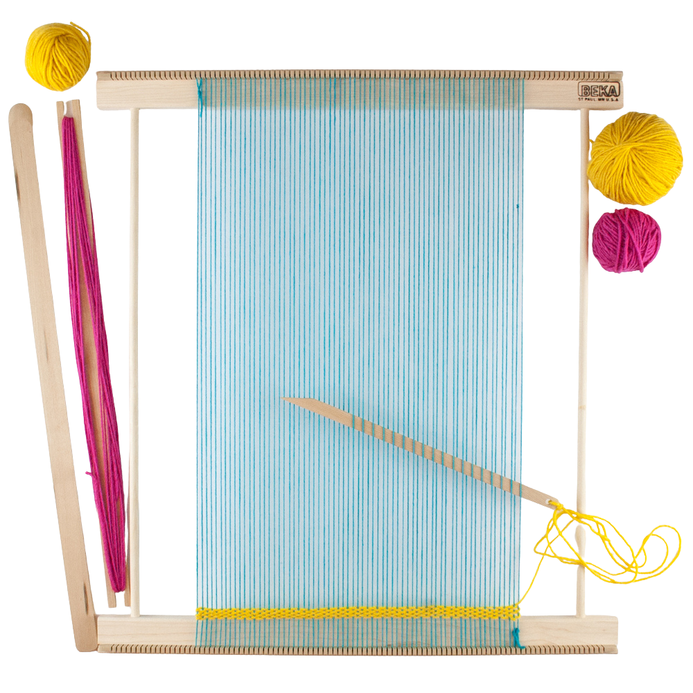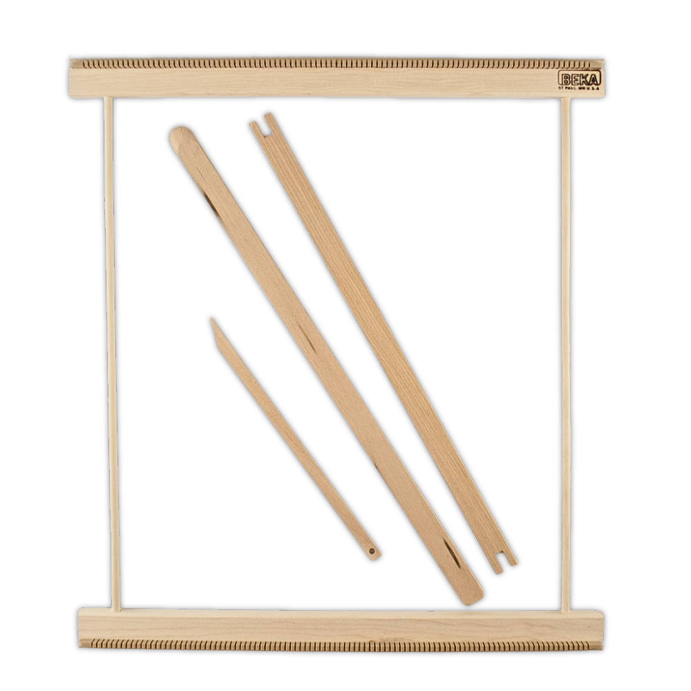Available in 10-inch, 14-inch, and 20-inch weaving widths, each BEKA frame comes with strong plastic teeth, smooth maple beams, and all the tools needed to start weaving right away. Simply add yarn and inspiration.
